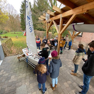 Bei Kinderpunsch und heißem Kakao bestaunten alle Anwesenden die Konstruktion von Rodolfo. Ein Opti auf Rädern, mit Ruder und Schwert vorbereitet für das Landtraining. Theresa hatte zum Trockentraining auch die Kinder eingeladen, die mit der Jüngstenausbildung starten. Neben der transportablen Übungskonstruktion sogte ein Ventilator für den fehlenden Wind. So konnten die ersten Versuche ohne schaukelndes Boot und ohne Gefahr einer Kenterung durchgeführt werden.